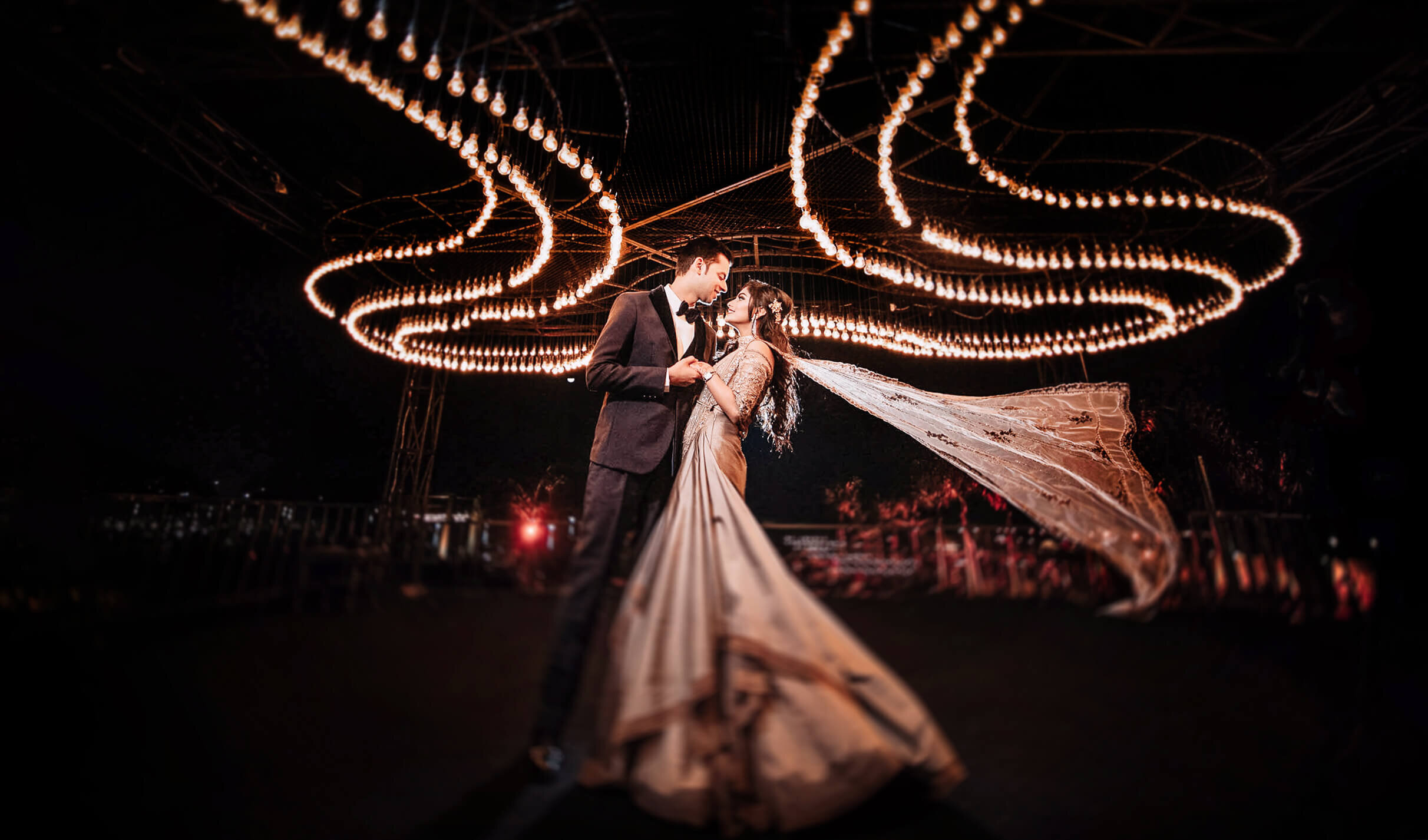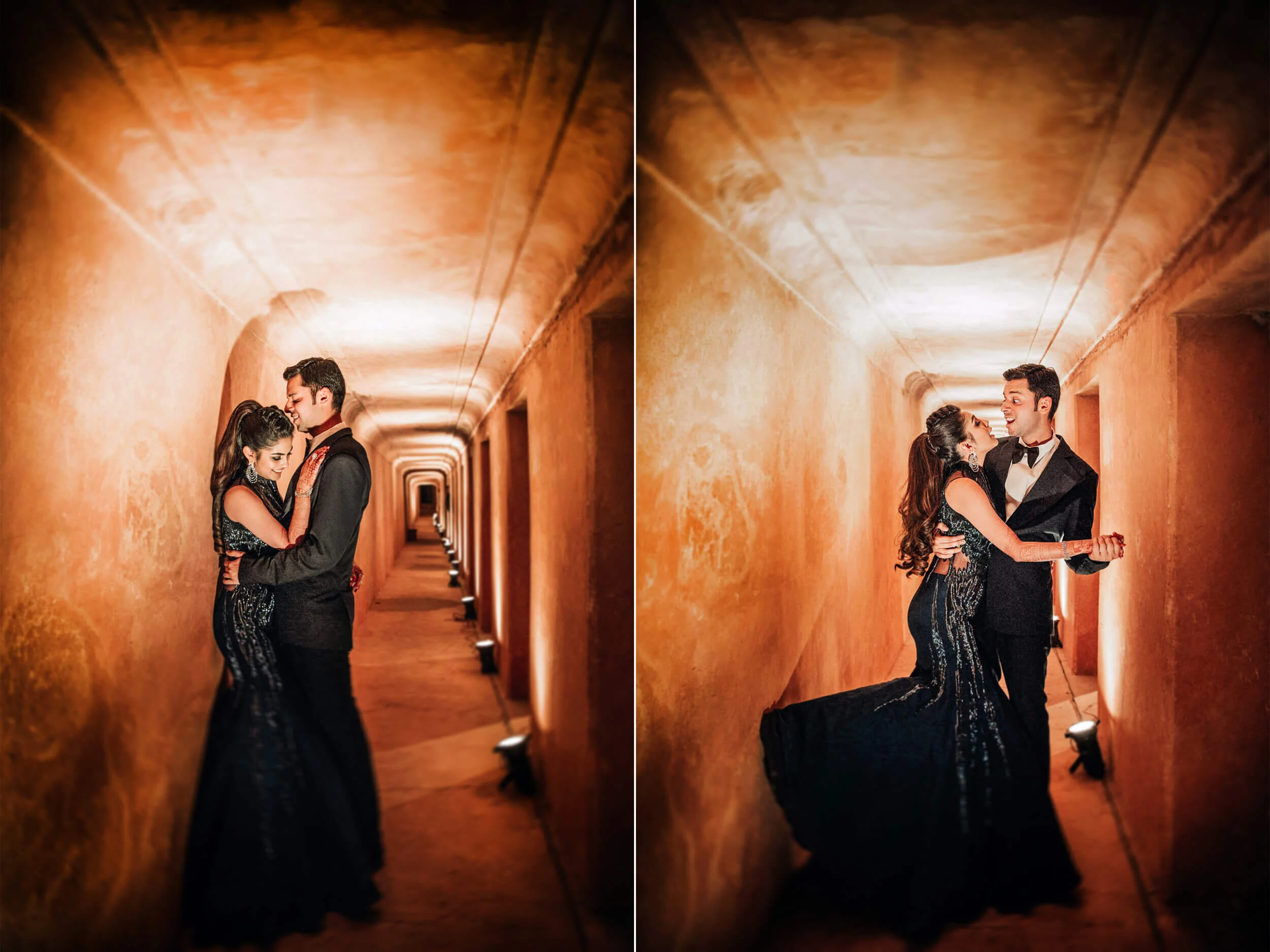 The beautiful couple, dressed in outfits from Shantanu & Nikhil and Matsya, posed for some portraits in the midst of gleaming incandescence after an evening of fun filled performances.